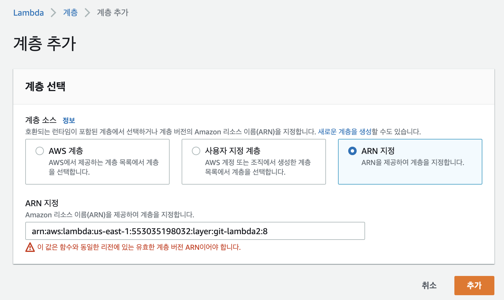 AWS의 lambda 안에서 git 명령을 사용하여(execSync를 이용) Run하면,