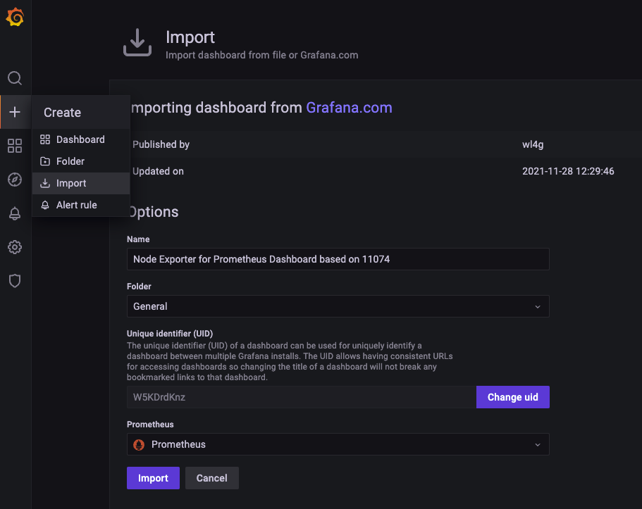 그리고 grafana Labs에 있는 dashboard를 하나 import 해보자. URl을 그대로 복붙해도 된다.