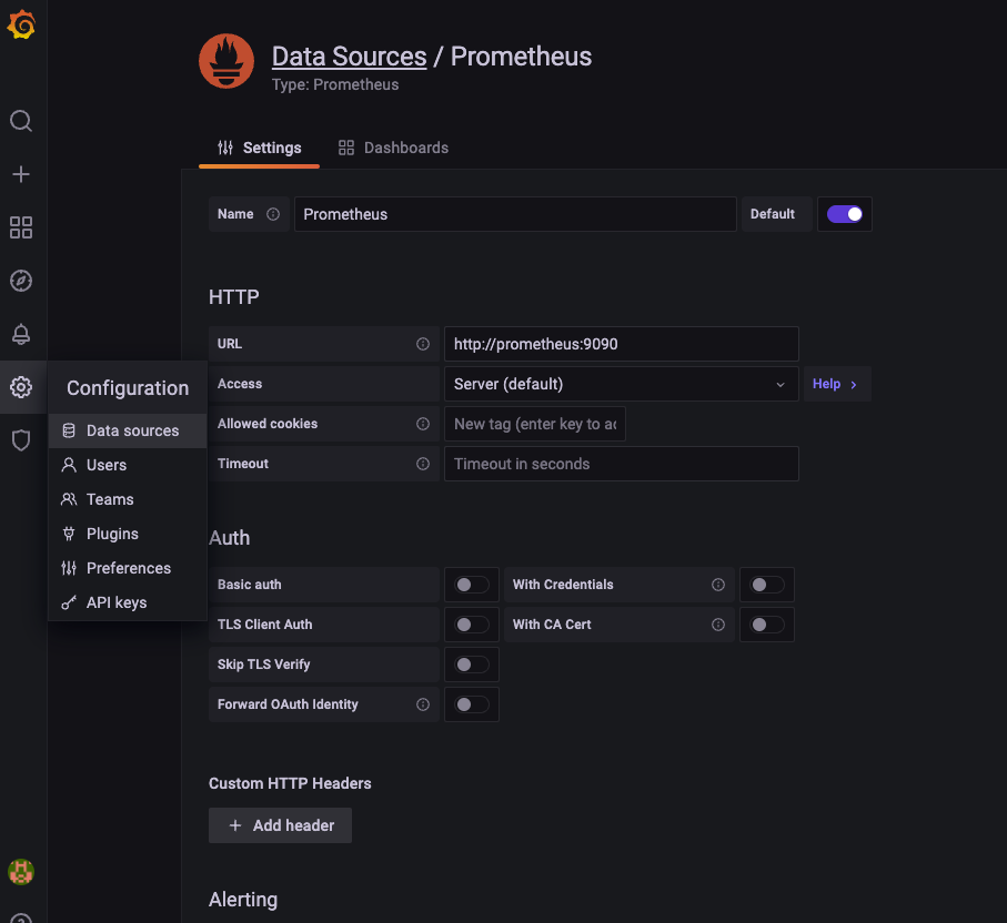 여기서 prometheus를 data source로 가져와보자.