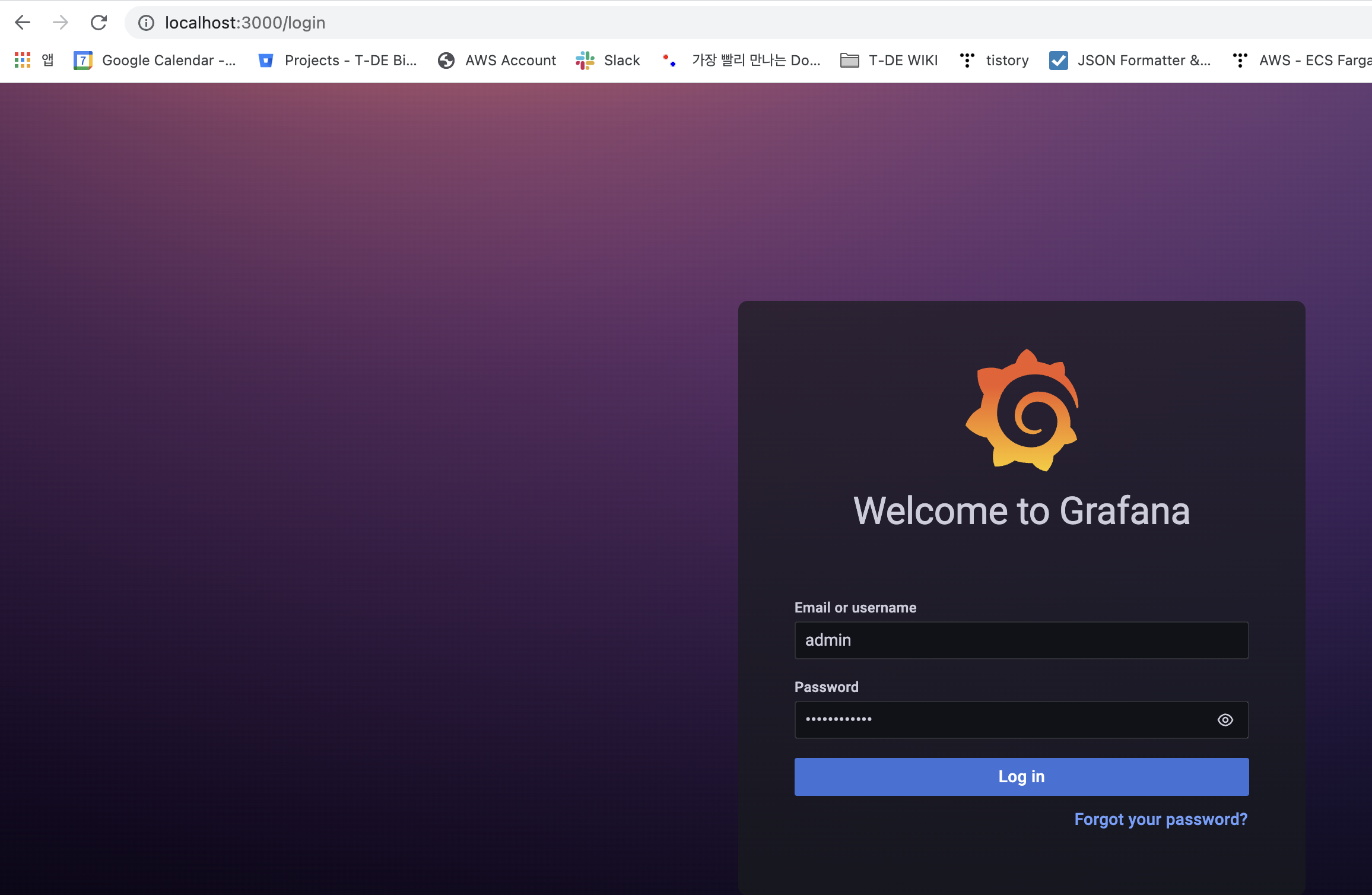 $ ssh -i [인증서].pem -p [local port] ec2-user@[ec2 public IP] -L 3000:[Grafana가 떠 있는 ec2]:3000