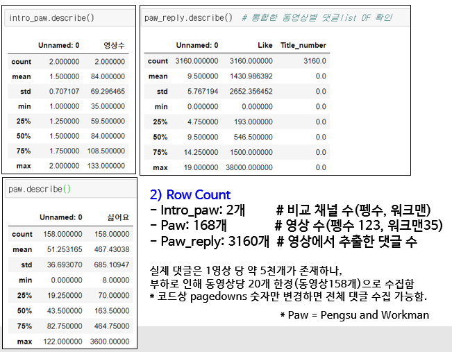 - 유튜브 인기채널인 '펭수'와 '워크맨'을 전반적으로 크롤링.