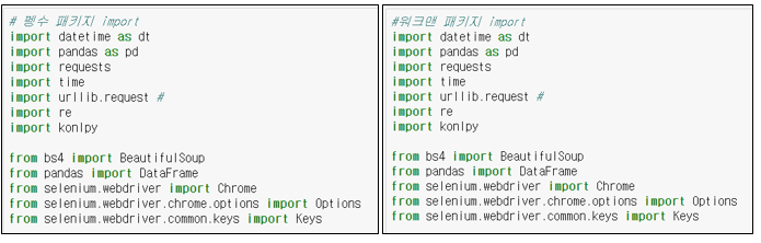 * selenium: 웹 브라우저를 제어하는 패키지. 유투브 화면 클릭, 스크롤 제어 등에 사용