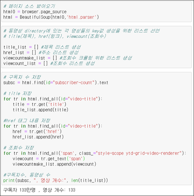 글이 많이 길어지는 관계로 다음 화에서는 각 영상별 제목 / 본문내용 / 조회수 / 좋아요 / 싫어요 / 작성일 / 주소 dataframe을 생성,