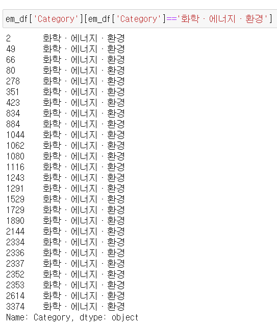 3) 그리고 True값을 가진 열을 '화학.에너지.환경'으로 값을 치환시킨다.