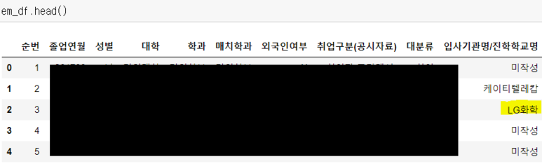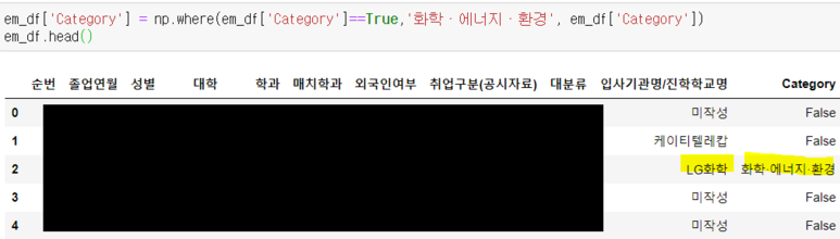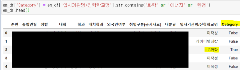 em_df.loc[em_df['입사기관명/진학학교명'].str.contains("화학"), 'category'] ='화학' em_df.loc[em_df['입사기관명/진학학교명'].str.contains("텔레캅"), 'category'] ='테스트중' em_df.head()