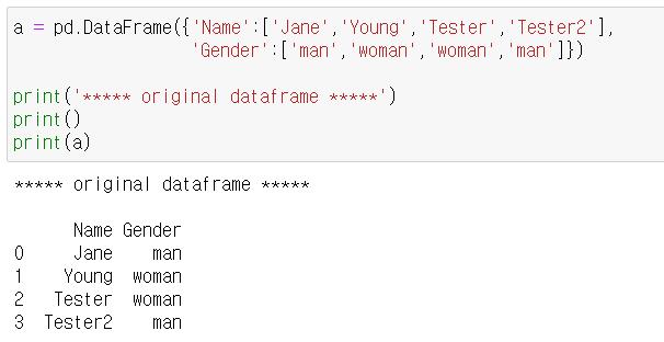 a = pd.DataFrame({'Name':['Jane','Young','Tester','Tester2'], 'Gender':['man','woman','woman','man']}) print('***** original dataframe *****') print() print(a)